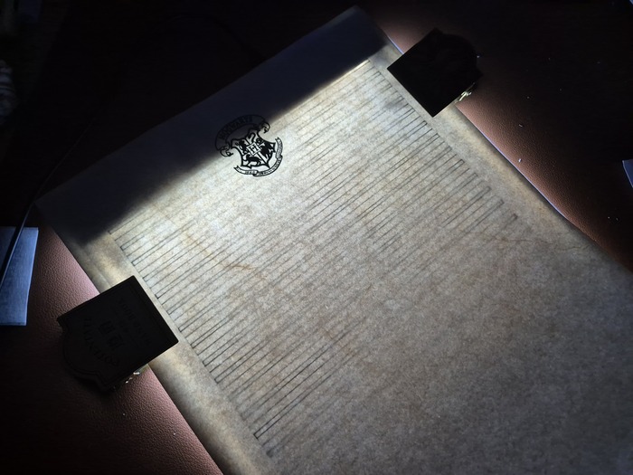 Переходим к оформлению листов. На окрашенные сухие листы по центру вверху ставим печать Хогвартса, я покупала ее на Озоне. В принципе листы готовы к письму, но...