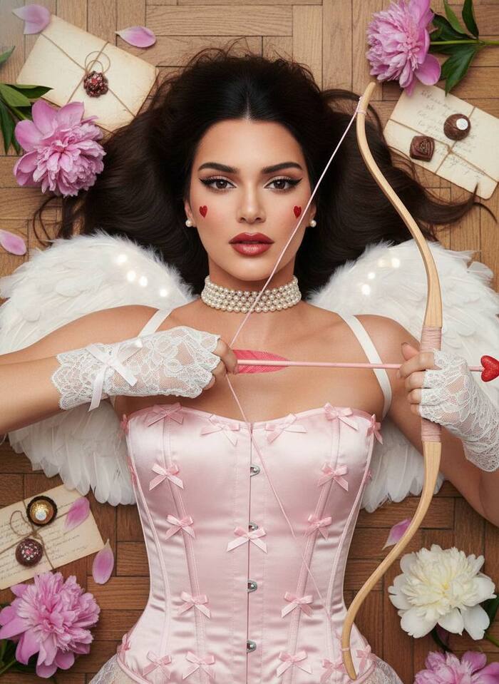 Не меняя внешности людей с фото, на фоне бархатистой розовой драпировки расположены молодой мужчина и женщина в анфас и три четверти. Девушка в образе ангела с легкой улыбкой и опущенным взглядом, в бледно-розовом корсете с тонкой шнуровкой и белой воздушной юбке, ноги в белых длинных чулках с широкой резинкой. На спине объемные пушистые белые крылья с детальной проработкой перьев. Многрядное жемчужное ожерелье с блестящим камнем украшает шею. Женщина опирается на правую руку, левой рукой тянет мужчина за галстук к себе, рядом на полу лежит затемный сухой жезл с мягким пухом. Мужчина в классическом черном костюме и белой рубашке полулежит рядом, тело повернуто к девушке, взгляд направлен на девушку. Мягкое софтбоксное освещение подчеркивает блеск глаз, текстуру ткани, перьев и волос, создавая романтичную, интимную атмосферу. Фотореалистичное изображение, высокая детализация, качество 8K