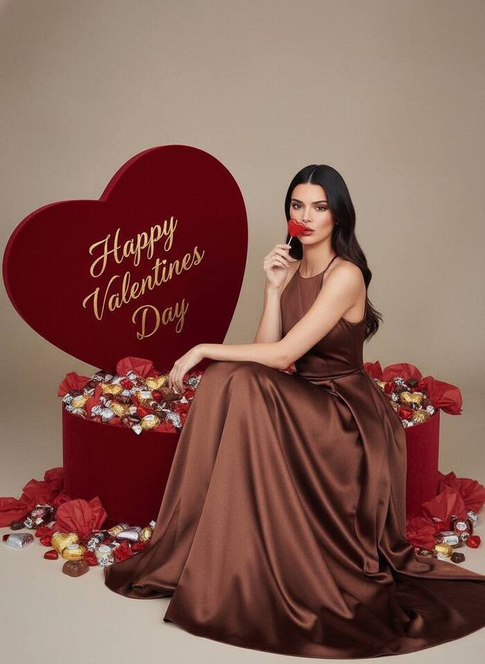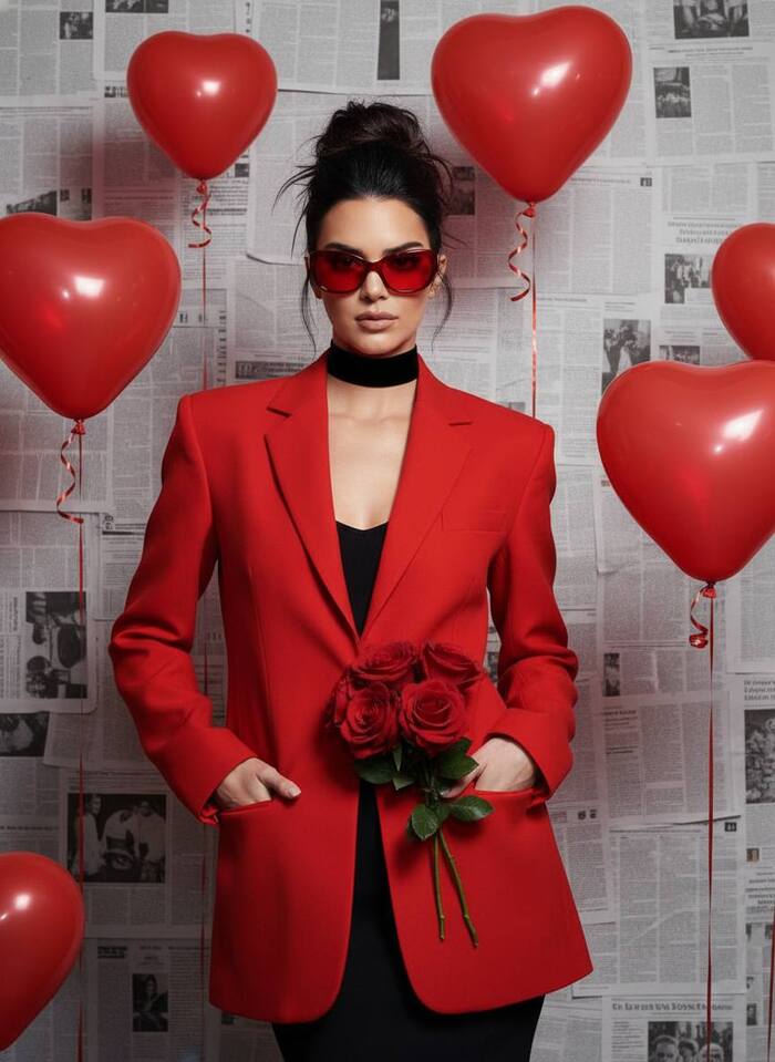 Не меняя внешности людей с фото, перед нами двое, погружённых в чувственный момент на светлом нейтральном фоне с выразительным крупным красным сердцем позади них, создавая атмосферу интимной страсти и взаимного притяжения. Первая женщина располагается в позе лёгкой растяжки, её тело повернуто в сторону мужчины, а взгляд устремлён вниз и немного в сторону, что подчёркивает мягкость и глубокую концентрацию на моменте. Её кожа сияет в мерцающем свете, выделяющем каждую бархатистую деталь блестящего чёрного облегающего платья без бретелей с кожаным или латексным блеском, который отражает свет и придаёт образу элегантность и дерзость одновременно. Длинные ноги женщины подчеркнуты изящными туфлями на высоких каблуках с колючими декоративными элементами, создающими контраст между хрупкостью и вызовом. Правая рука женщины поддерживает позу, полностью раскрывая её изгибы, правая кисть частично скрыта, что создаёт лёгкую загадочность. Волосы длиной чуть ниже плеч естественно падают, слегка волнуются, подчёркивая тонкую линию шеи и открытые плечи. Второй мужчина сидит за женщиной, его тело развёрнуто к ней, левая рука обнимает её за спину, а правая частично лежит на полу, неразличимо насколько активно задействована. Мужчина практически обнажён в верхней части тела, демонстрируя татуировки на груди и предплечье, которые чётко видны и придают образу контраст между жёсткостью и уязвимостью. Взгляд мужчины скрыт за красными солнцезащитными очками, добавляющими загадочности и стилевого шика. Свет падает сверху с правой стороны, чётко подчёркивая текстуру кожи, блеск одежды и контуры тел, создавая выразительные тени, которые усиленно воспроизводят драматизм и интимность сцены. Сцена насыщена чувственным напряжением в современном стилизованном ключе, подчёркнутом минималистичным фоном и монохромностью одежды с ярким акцентом в виде красного сердца, которое будто обрамляет их союз, фотореалистичное изображение, высокая текстурная детализация, высокое качество, разрешение 8K.
