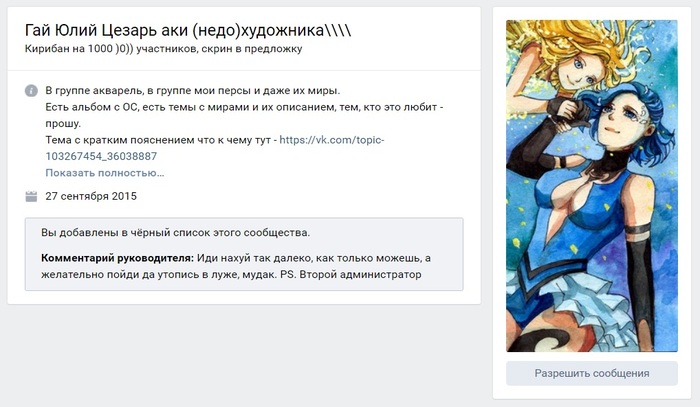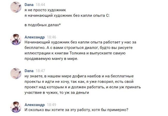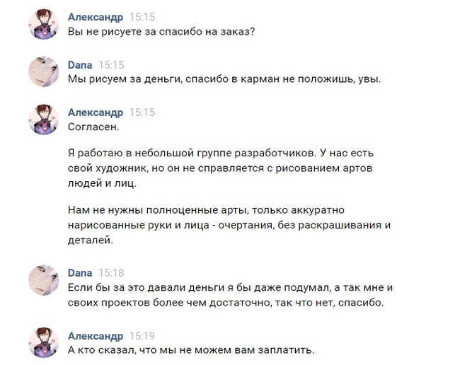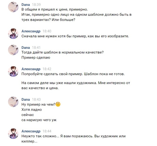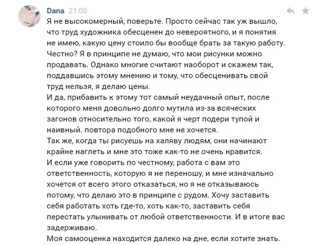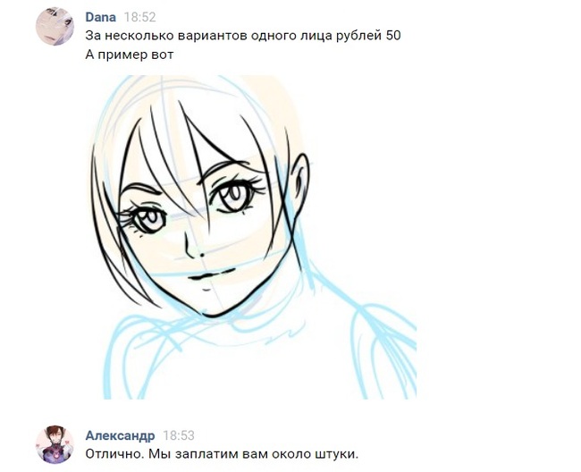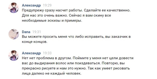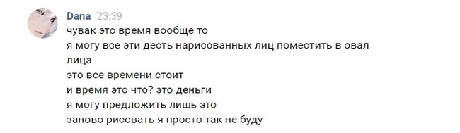 Ничего не предвещало столь огромного разочарования в тот злополучный день, когда группа творческих людей, одержимая идеей создать яркий, красочный проект, обратилась за помощью к вот этой молодой леди(https://vk.com/by_pdh). Юная художница, необыкновенная настолько, что пишет о себе в мужском лице и одаренная до такой степени, что в результате ее художеств на свет появилась эта статья. «Я буду оочень рад, если кто-то изволит желание заказать у меня что-нибудь… Обещаю стараться и рисовать нормально, а не как всегда… буду ждать и верить, что хоть кто-то когда-то что-то закажет» Именно эти многообещающие слова красовались на баннере на ее странице. И мы, творческие люди, блуждающие по интернету в поисках второго художника, способного украсить наш проект своим творчеством, написали этой особе, пообещав щедрое вознаграждение за предоставленную помощь. Задание было простым – нарисовать для персонажей несколько красивых лиц в разных перспективах. На просьбу продемонстрировать свой талант на практике, девушка скинула образец, который полностью удовлетворял нашим запросам и мы сели за стол переговоров. Первый тревожный звоночек прозвенел в тот момент, когда девушка, списавшись с нами для уточнения деталей, начала качать права и обвинять нас в том, что мы плагиаторы, потому что своровали из общего доступа шаблоны для обучения рисованию, решив позаимствовать несколько поз и сделать из безликих манекенов полноценных персонажей. Из-за этого наше, как выяснилось, заведомо неудачное сотрудничество, чуть не сорвалось из-за «типа чести и гордости художника». Разрешив этот маленький конфуз, один из наших творцов попытался объяснить барышне суть и детали работы. Сообразительность этой девушки заставила его пробить фейспалмами лобную долю. Однако, не смотря на не самое лучшее первое впечатление и скверный характер, мы до последнего старались быть максимально вежливыми и терпеливыми и даже согласились на предоплату и крайне неудобный для нас способ передачи средств, помня, что все это во имя красивых лиц. Получив заказ, девушка видимо, впервые в жизни узнала, что оказывается для того, чтобы рисовать за деньги нужно много сил, времени и… умение рисовать! Потрясенная до глубины души этим внезапным открытием, юная художница, поначалу так уверенно заявляющая о своем мастерстве, стремительно дала по тормозам, потратив на раздумья больше суток нашего драгоценного времени. Не желая сдаваться, и без того пострадавший творец, не взирая на головную боль и расшатанные ранее нервы, принялся уговаривать ее поработать с нами, пытаясь вытащить из нерадивой словесными клещами адекватную причину отказа. «Я просто не хочу ответственности. Я ее боюсь, а деньги это ответственность…» Заявила художница, публично заявившая о своем желании рисовать за деньги. «…и бесплатно рисовать я тоже не хочу и это мое право.» Кто угодно уже давно бы опустил руки. Но только не наш отчаянный творец, потративший целый вечер на то, чтобы вразумить неразумную, перепробовав все, от суровой правды… «-Я начинающий художник без капли опыта С:» «-Начинающий художник без капли опыта работает у нас за бесплатно. А с вами строиться диалог, будто вы рисуете иллюстрации к книгам Толкина и выпускаете самую продаваемую мангу в мире.» «Есть большая разница между заказом и просьбой. Между продажей тв
