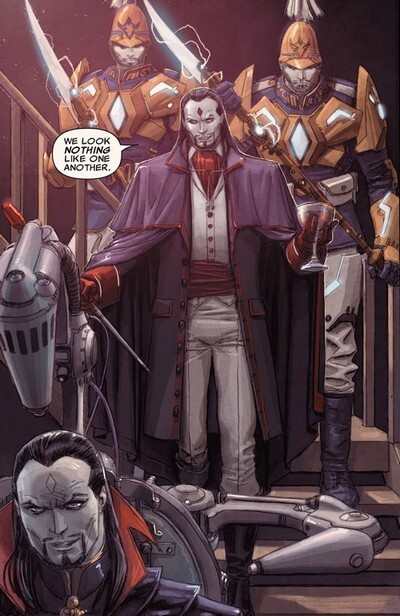 И вот тут самое время задать вопрос, а как там поживает Мистер Синистер? А ответ находится в комиксе Uncanny X-Men #14 за август 2012 года, от Кирона Гиллена и Дастина Уивера. Место действия – Зловещий Лондон. Это город, расположенный под землёй, и выглядящий, как идеализированная версия Лондона викторианской эпохи, в котором живут только клоны Мистера Синистера. Синистер-вагоновожатые управляют троллейбусами, в которых ездят Синистер-пассажиры, Синистер-шарманщик с Синистер-обезьянкой развлекает Синистер-детей, и на всех жителей города приходится один разум – разум Синистера. Но есть в этом обществе один «гадкий утёнок» - Синистер-репортёр, выбивающийся из общей массы. Он не такой, как все, он вольнодумец, и его это тревожит. Синистер-репортёр уверен, что Синистер-король определяет судьбу всего общества, лишая его свободы развития, и потому планирует короля убить. И у него есть такая возможность – он как раз собирался взять у Синистер-Прайма интервью.