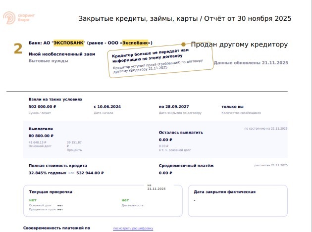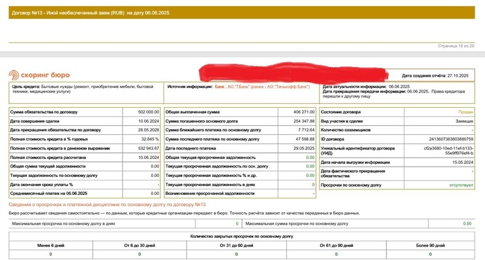 06 июня договор ушел в цессию, банк отчитался по принципу "и так сойдет". Получилось, что от Т-банка договор ушел с одной суммой долга, а в "Экспобанк" пришел с другой суммой, существенно большей. По этой причине кредит формально выглядит долговым. Как так получилось -- вопрос дискуссионный. Пруфы: