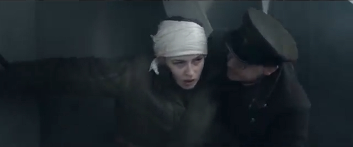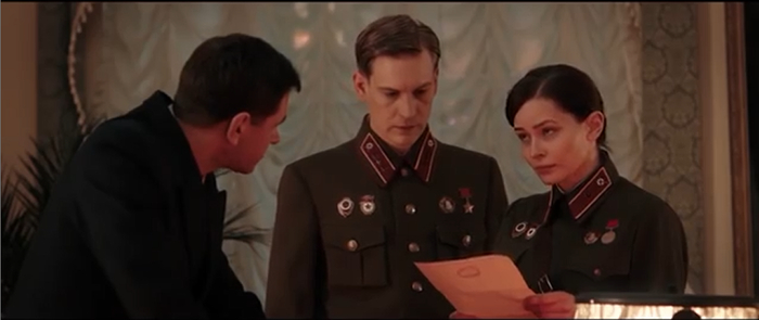 Тут же Юлия Пересильд с каменным выражением лица, для пущего драматизма, тащит на себе иссечённого осколками Алексея, а потом бьется в истерике. В следующей сцене, раненая в спину Людмила находится в госпитале, Борис сообщает ей о гибели Алексея. Так же Борис сообщает, что Людмила теперь комиссована, но тут с фотоаппаратом приходят злобнее упыри из НКВД и говорят, что о комиссовании не может быть речи, так как Людмила непросто боец а СИМВОЛ, а символ нельзя комиссовать.