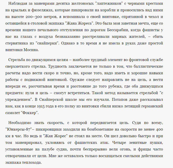 «Когда я проходила по улицам Севастополя, меня часто останавливали ребятишки и спрашивали: “Сколько вчера убила?”. Я обстоятельно докладывала им. Однажды мне пришлось честно сказать, что я уже несколько дней не стреляла по врагам. “Плохо”, — в один голос сказали ребятишки. А один, самый маленький, сурово добавил: “Очень плохо. Фашистов надо убивать каждый день”».