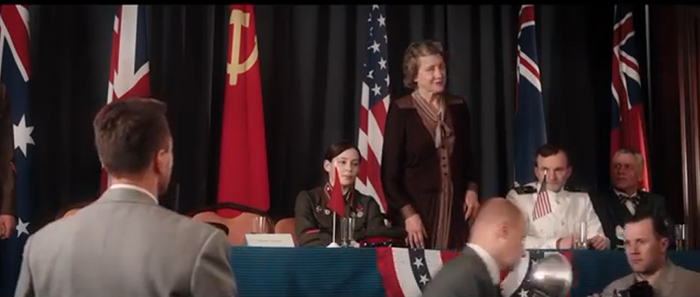 Ну что тут сказать. Режиссера картины, никто за язык не тянул, он сам сказал что изучал архивы, биографическую литературу и прочее, тем не менее без искажения некоторых фактов, и без злобных упырей НКВД в картине опять не обошлось. Ну и как же без того, чтобы в фильме о войне, не показать в очередной раз, историю про ЛЮБОВЬ. Итак. Москва. 1957 год. В аэропорту Внуково, в машине сидит Элеонора Рузвельт, прилетевшая в СССР с визитом. Элеоноре говорят, что её ждет лично Никита Сергеевич Хрущев, на что вдова Франклина Рузвельта заявляет, что пускай подождёт, у неё должна состоятся более важная встреча по другому адресу.