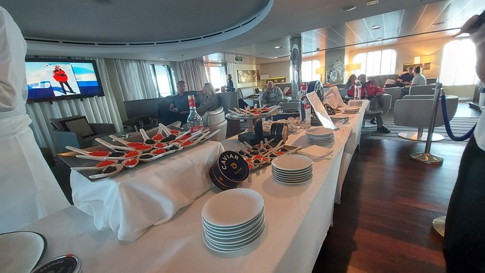 Ещё одной особенностью в этой компании является наличие различных дней дегустаций в круизе. Дегустация французской икры, фуагра,коньяка и т.п. В этом круизе на нашу долю выпала организация дегустации французской икры (тогда,я кстати,впервые в жизни попробовала чёрную икру, да ещё и ложкой и с осознанием, что одна баночка стоит тысячи евро).