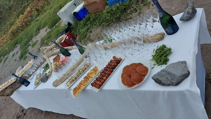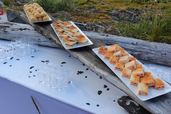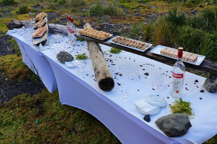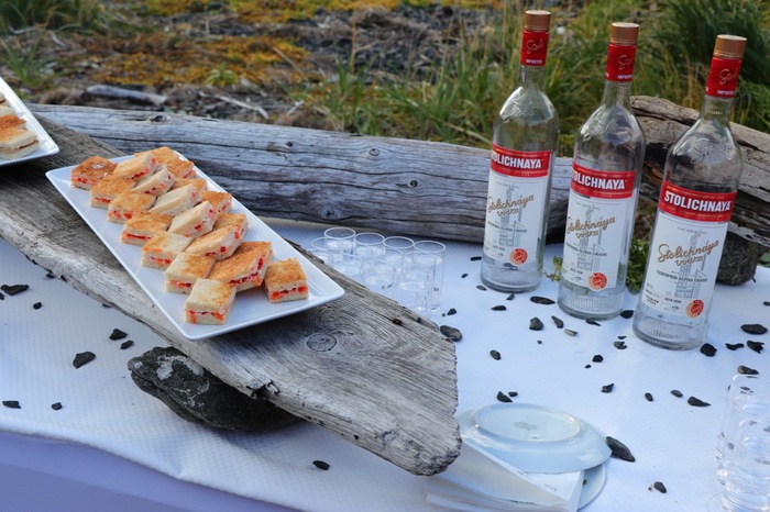 В этой компании также есть особенность для работников бара - делать выездные сетапы алкоголя и перекуса для гостей на суше. Всё загружается в ящики и на зодиаки, затем перевозится на берег, там из подручных средств нужно сделать красиво. Первую такую вылазку я пропустила, так как была не моя смена (но прикреплю фото от фотографа), а вот на вторую я попала и училась у барменеджера делать сетап из деревьев и каких-то досок. Интересный опыт. Честно, не знаю, что в обычные времена бармены сервируют в холодных регионах для гостей в таких круизах, но так как наши гости были русские, в приоритете была водка и шампанское.