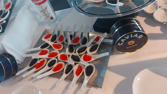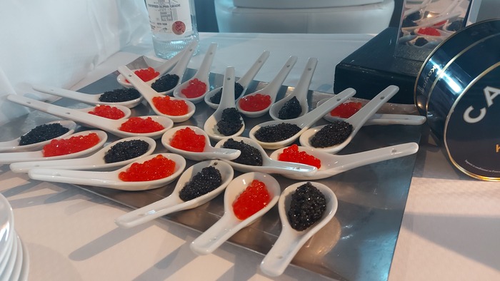 Сетап мы делали совместно с кухней, по плану было раздать 1 кг икры максимум, ответственным за это поставили французского повара из ресторана. Наша задача была разносить эту икру, брать заказы на напитки и подавать напитки.