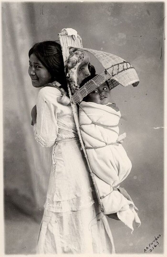 В плоскую основу из дерева, обтянутую оленьей кожей, помещался ребенок, которого туго пришнуровывали. И с помощью специального ремня люлька закреплялась на спине у матери.