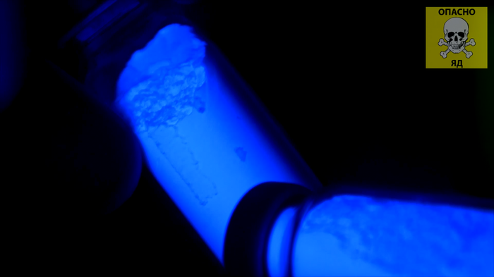 Так, теперь переходим к следующим образцам. На кадрах так же кристаллы йодида аммония и ацетата таллия, только концентрация таллия уменьшена в 200 раз, по отношению к первым образцам, как мы видим желтый цвет превратился в синий. Удивительная природа таллия и его соединений, просто потрясающе. Люминесценцией эти соединения не обладают, они лишь светятся под воздействием ультрафиолета.