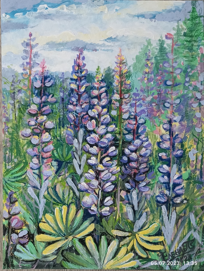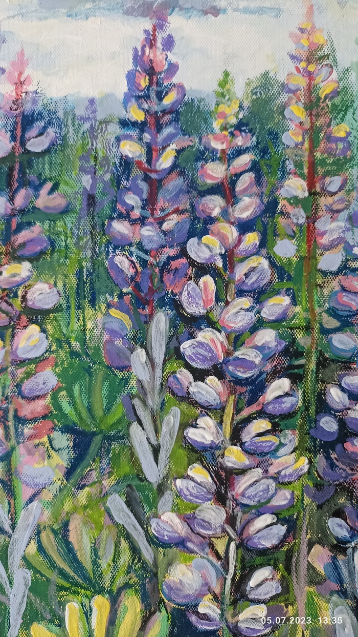 Работу выполнила акрилом и масляной пастелью на холсте, затем закрепила спрей-лаком.