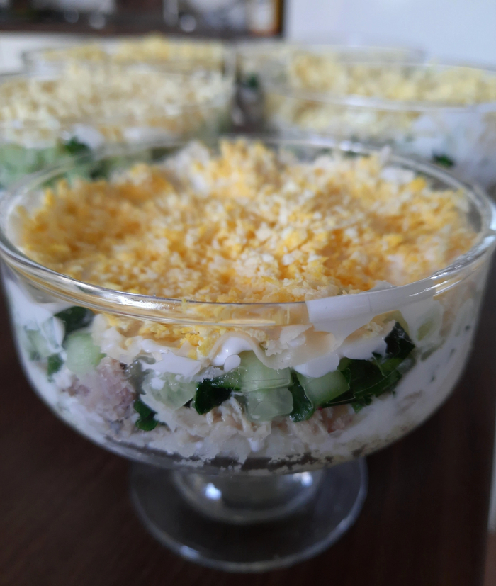 Салат "Мимоза" со свежими огурцами. Настоящий тунец для Путанеску был только в третьей банке, остальных типа тунцов пустила на салат. Вкусный салат.