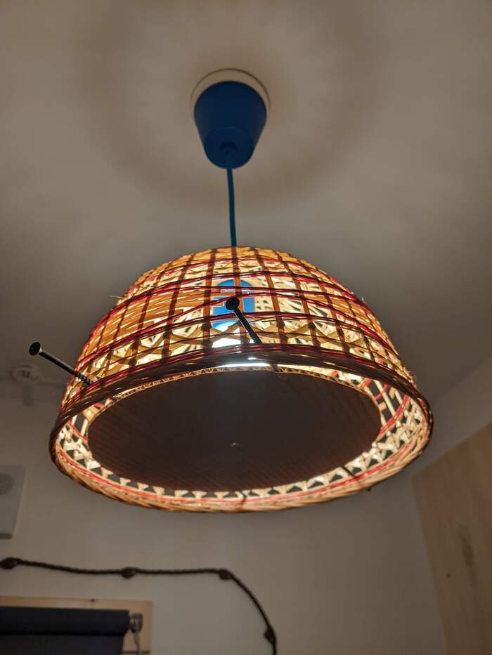 Изучив советы здесь и на реддите, понял, что лучшим вариантом будет заменить на цветной картон, который лежит на паре переплетённых нитей - картон легко снимается, рука пролезает и можно лампочку заменить.