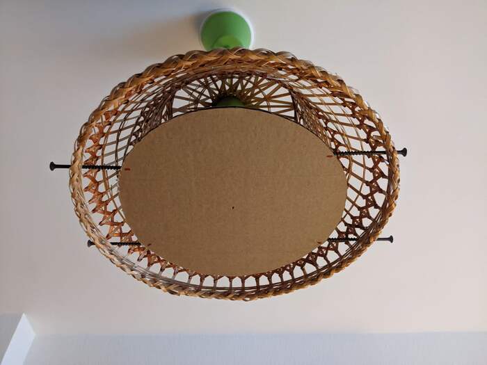 Дорабатываю светильник подвесной, нужен совет. Смысл в том, чтобы свет не падал на голову, а рассеивался по потолку и в стороны. Для этого вырезал круг из картона и саморезами его закрепил на абажуре. Как сделать это более аккуратно? Допусти, картон можно заменить на фанеру, а саморезы?
