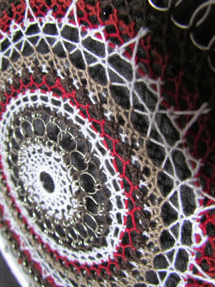 Главное кольцо я решила сделать строгим, лаконичным, сдержанным. Из украшений на нем бусины из лабрадорита и металлические колечки на мотив кольчуги. Ну и узоры из перепетения нитей, конечно)