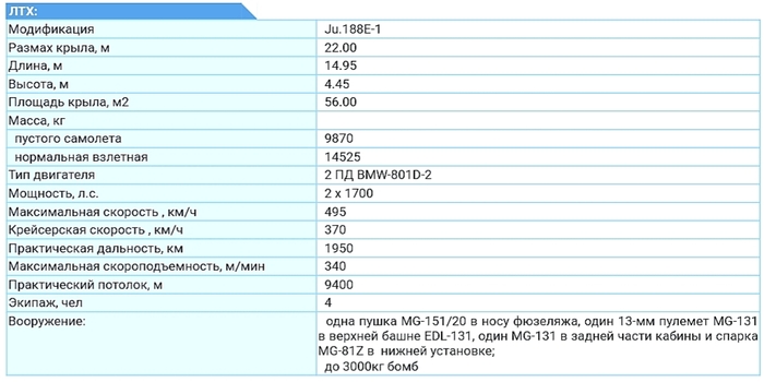 А в марте 1943 года с конвейеров заводов в Бернбурге сошло семь Ju 188Е-1 с моторами BMW 801С-2 (взлетная мощность — 1700 л.е., на крейсерском режиме (Н = 6000 м) — 1440 л.е.). В апреле выпущено еще восемь машин той же версии.