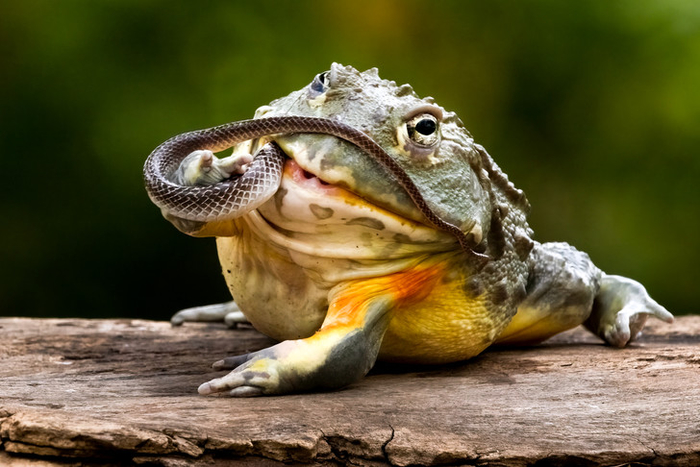 Самые здоровые лягушки-быки могут жрать даже детенышей аллигаторов и больших ядовитых змей.