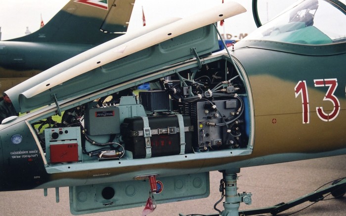 В носовой части расположена радиоаппаратура и кислородные баллоны (голубенькие выглядывают). Отрабатывая действия в особых случаях, при невыпуске носовой стойки шасси, надо оооооочень акуратно сажать самолет (а неуверен -- лучше катапультируйся. Так проще и безопаснее), ведь носовая часть может стесаться об бетон на скорости 200км/ч, а баллоны кислорода могут загореться или взорваться.
