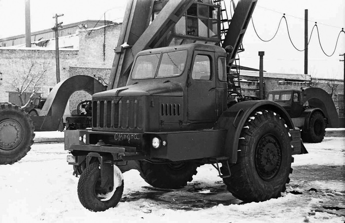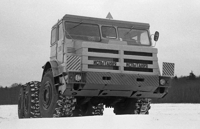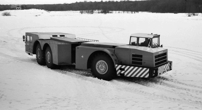 Инженерный тягач МоАЗ-542А, 1963 г. Интересен, в частности, пневмогидравлической подвеской управляемого моста (второй мост подвешен жёстко). Но дизайнер необходим!