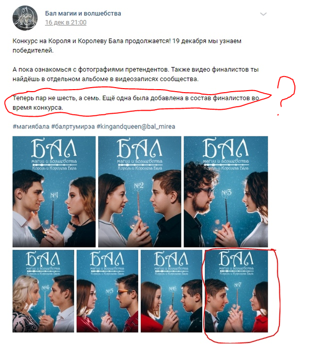Именно видео визитка седьмой пары была залита в группу в этот же день - 16-го декабря, в корне нарушая регламент проведения конкурса на Короля и Королеву. Стоит так же отметить, что имена седьмой пары отсутствовали даже в списках участников предновогоднего бала. А если тебя нет в этом списке, то ты и потанцевать  не сможешь на балу, не говоря уже об участии в конкурсе на главный приз (https://vk.com/@bal_mirea-spiski-fakultetov-1 - список участников бала).