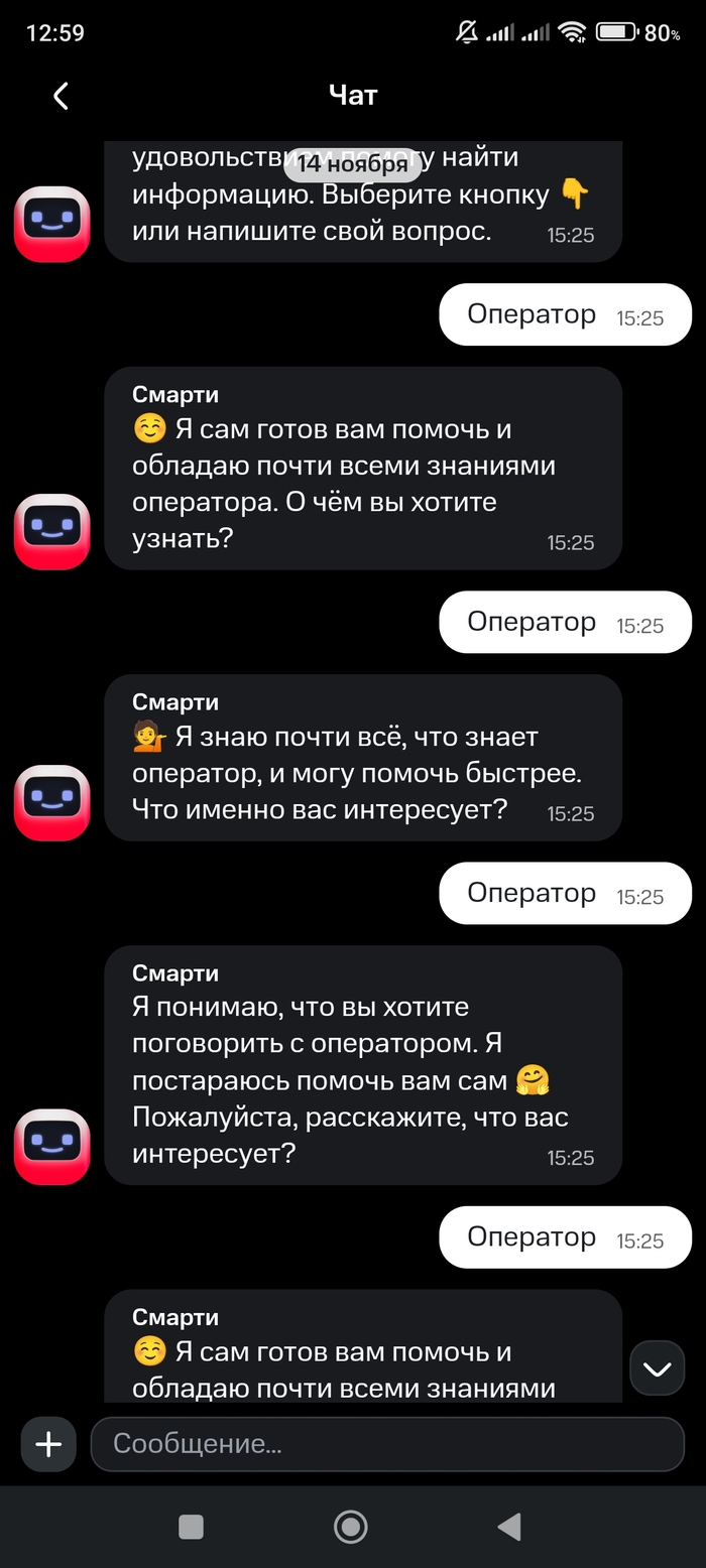 Проходят сутки, толку ноль. Пишу снова. К слову сказать, оператора позвать не так просто, автомат отвечает несуразицу...