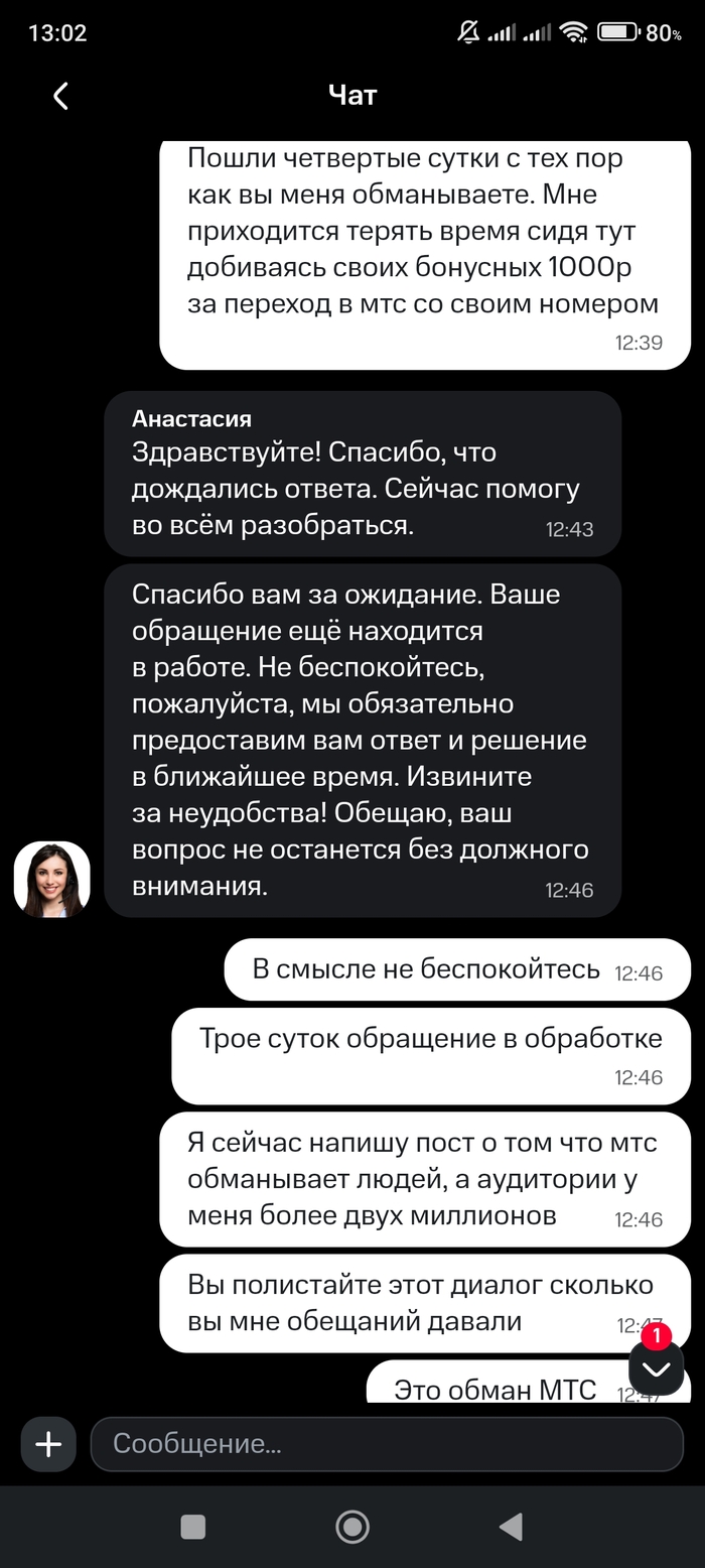 Спустя сутки добиваюсь ответа оператора что да легко дайте нам пару часов... И снова глушняк. То есть по мнению МТС я должен сам им написывать в день по десять раз и выпрашивать эти 1000р. Ждём пару часов... Тишина как в танке