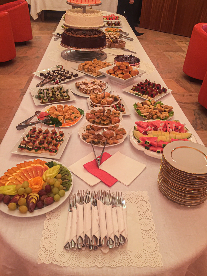 Сходила на приём в Посольство в честь Восьмого марта. Все было очень душевно. Стол, как обычно и бывает на подобных мероприятиях в посольствах, ломился от яств - гвоздем программы были «pirozhki» ручной лепки.