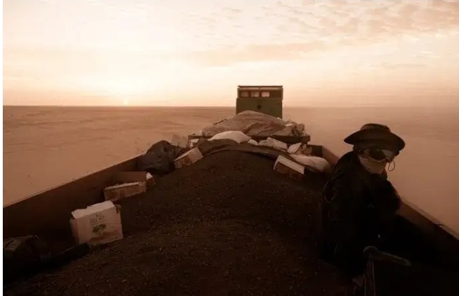 Майкл сидит на железной руде поезда в Сахаре, используя шарф в качестве маски от пыли.