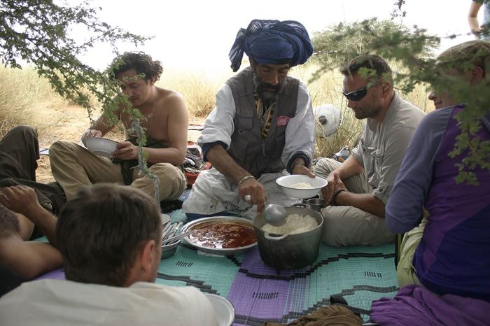Однажды над нами даже нависла угроза голодной смерти. Дело в том, что администратором и снабженцем нашего похода обреченных был очень своеобразный персонаж - Абдурахман (он же Абдулка). Особенностью этого горячего местного парня было то, что он делал не так все, что можно было сделать не так. Он путал дни, опаздывал, упал с верблюда и потерялся, а потом нашелся среди ночи. В результате нам пришлось наблюдать, как работает пустынная доставка еды. Выглядело это реальной такой магией (возможно даже черной и с человеческими жертвами). В какой-то момент Абдурахман куда-то смылся, потом триумфально вернулся и заявил, что завтра будет машина с едой. А завтра посреди пустыни нас встретили какие-то местные жители в белоснежных одеждах, которые и правда привезли еду. Черт его знает, как это работает. “Привет, братва, у меня там бешеные русские через Сахару идут пешком и у них еда закончилась - привезете им добавки? - Фигня вопрос, брат, завтра заедем в пустыню, отдадим”. Наверное, как-то так это и работает.