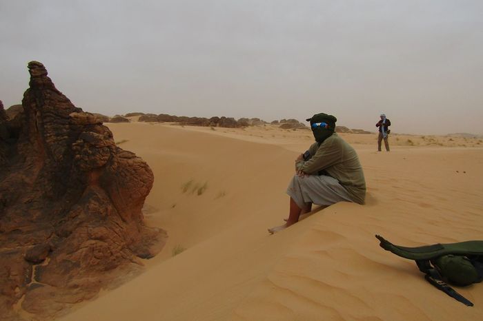 А теперь я, пожалуй, расскажу про наш самый трудный день. Начался он, правда, вечером. Мы остановились на ночевку у очень странной скалы – Хишам сказал мне, что местные её побаиваются, это место считается проклятым. Скала и правда была необычная. В ней что-то пело, представляете? Я буквально зависала, слушая невнятный шепот и тихое… пение? Музыку? – какие-то странные звуки, идущие от скалы. Ветер к вечеру становился все сильнее, ужин запаздывал, так что спать мы легли поздно. Разбудил меня полный рот песка. Мой рот то есть. Заодно полный нос и полный спальник – это началась песчаная буря, которая задувала ровно с той стороны, куда я была обращена головой.