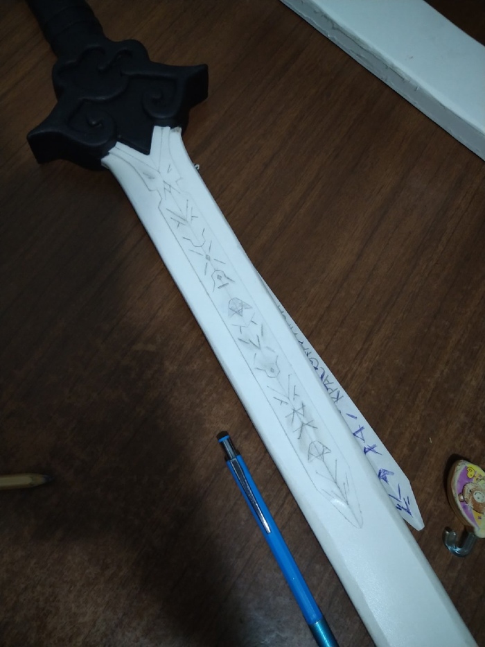 Начертила на ПВХ меч с рукоятью (2 детали, но у меня не было достаточно пвх, поэтому продублировала только лезвие), вырезала. Между деталей вклеила пластину из аллюминия, что бы меч не гнулся и для подстраховки, что бы рукоять не отвалилась.