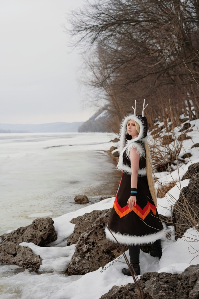 Этот косплей, как и многие другие был сделан своими руками. Пошив, аппликации из ткани, оторочка мехом. А ещё у нее есть красивый бубен, который светится в темноте! С помощью него Зоря пользуется своей силой шамана.