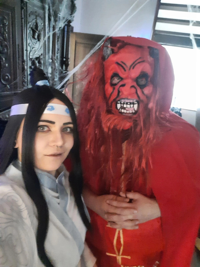 И вот перед Хеллоуином я узнаю, что моя знакомая продаёт костюм на этого персонажа. Решение было принято молниеносно. Я одолжила у подруги парик, накрасилась, надела линзы и образ был готов. Брат, кстати, был в костюме китайского демона, так что образы получились почти парными. Всё ещё не вполне косплей, но мне до сих пор нравится как у нас все получилось. А полноценный косплей на этого персонажа с доработками и крафтом я покажу попозж))
