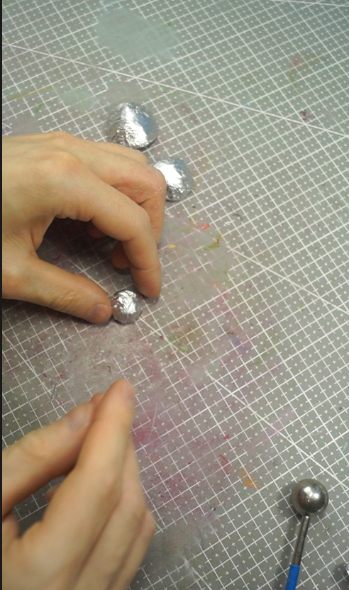 2. Ножки готовы, теперь можно и шляпки сделать. Снова фольга, но теперь уже она будет являться каркасом. Я взял немного фольги, сложил её в несколько раз, придав форму квадрата, а дальше из него уже формирую шляпку. Повторяю действия с глиной из предыдущего этапа, тонкий слой глины накладываю на шляпку сверху, разравниваю, излишки удаляю. Неровности можно удалить либо вручную, или же просто добавить пару капель размягчителя и кистью равномерно распределить, он своё дело сделает. И отправляем шляпки в печь.