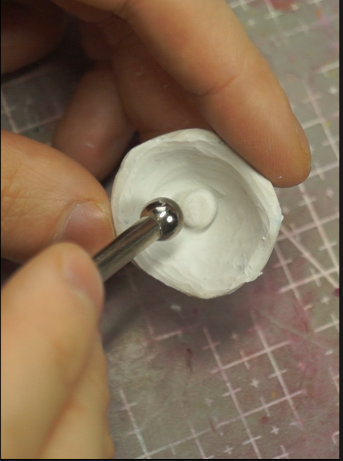 Снова тонкий пласт глины, но теперь уже прикладываю его на внутреннюю сторону шляпки. Также добавляю небольшой кусочек глины прямо в центр шляпки, это будет основание, которое соединит шляпку с ножкой. Края бочонка разравниваем, в середине делаю углубление самой ножкой, чтобы всё идеально подошло.