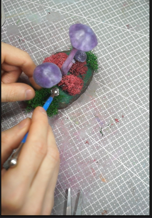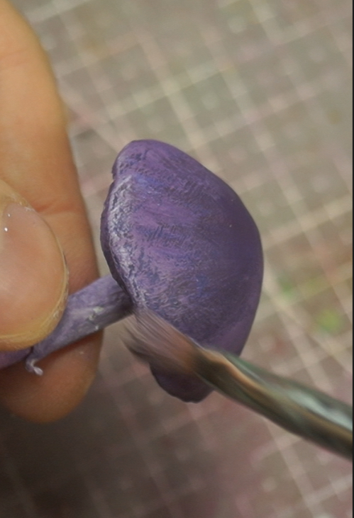 4. Предпоследний этап - покраска. Тут всё просто: сначала покрыл грунтом, далее уже покрасил в желаемый цвет(фиолетовый), придал оттенков, бликов. Также изначально у меня была мысль добавить флюоресцентного пигмента, чтобы грибы светились в темноте. Но я так увлёкся покрасом, что совсем забыл про него 😅
