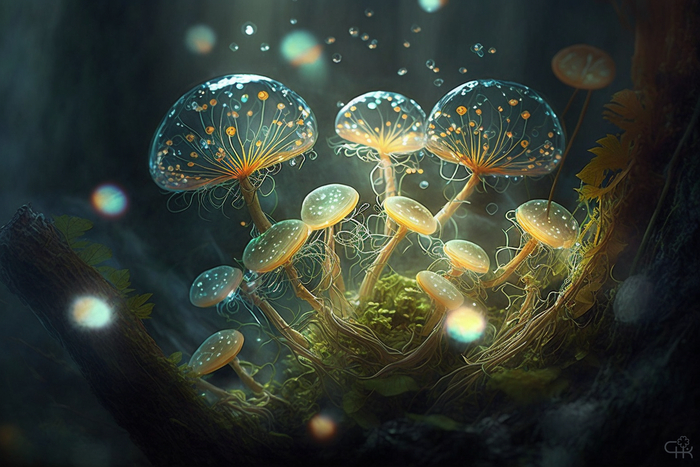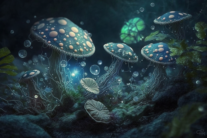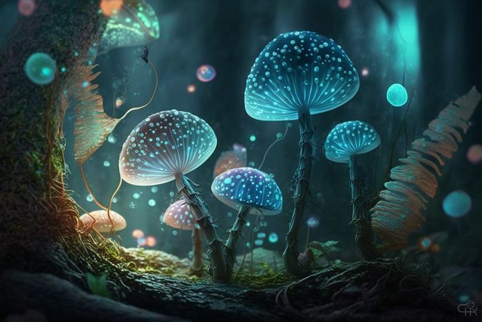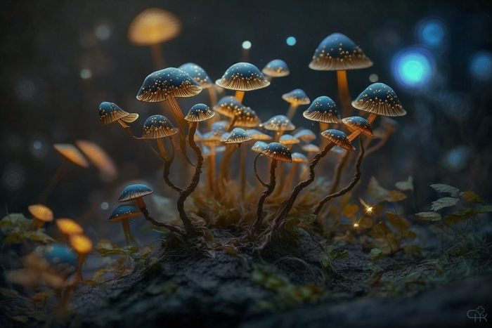 Промпт: Luminous whimsical mushrooms in a magical fairy forest:: sparkling dewdrops:: in the moonlight of a night forest:: photorealism: photo wallpaper --ar 3:2 --s 750