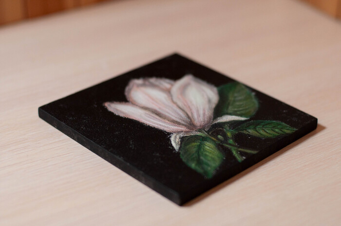 И сегодня на повестке дня магнолия. Нежная миниатюра, в минималистичном стиле. Лаконичный черный фон. В качестве основы артборд. Размер 13×14.