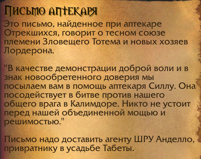 На причале рядом с домом Табеты все время отирался подозрительного вида незнакомец. Или Оул рассуждал про содержимое письма вслух или у незнакомца было уж очень развита интуиция, но завязался разговор, и маг узнал, что это агент ШРУ и он хотел бы выкупить письмо так как в нем очень важные доказательства для ряда теорий разведки Штормграда.