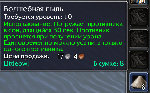 Кстати, это действительно мой совет для тех, кто играет в Хардкор режиме. Не нужно жадничать. Сколько раз у меня были расходники, которые в итоге просто сгорали вместе с персонажем. А в момент думаешь «не, я сейчас смогу и так спасти персонажа». Другим советом, раз уж я тут целую рубрику открыл, будет не выбрасывать расходники с заданий. Даже с тех, что были в стартовых локациях. Ряд таких вещей как всякие порошки и пыли, которые могут уменьшить броню противника или увеличить шанс промахов. Большинство таких вещей теряет свою эффективность на высоких уровнях, но для некоторых заданий со сложными врагами – это повышает боеспособность. Да, и просто вселяет больше уверенности, дает какой-то арсенал из приемчиков. Но действительно полезной вещью, которую можно даже иногда подфармливать Альянсу – это "Волшебная пыль" с пылевых демонов в Западном Крае. Предмет я проверял на уровнях до 40 и он работает отлично. В теории будет работать и на уровнях выше, но нужно проверять. Я лично с пяток штук с собой стараюсь таскать и держу на одной из панелей доступа.