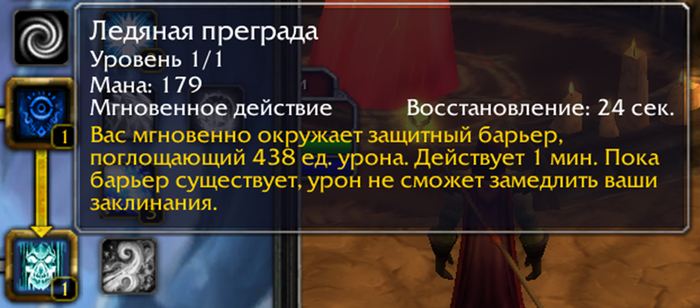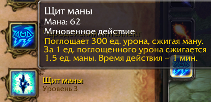 Вот не помню точно, но вроде бы на сороковом уровне был уже третий уровень этого заклинания. И действует оно так, что пока время действия у заклинания не истекло – 300 единиц урона (в данном случае) отминусуется не от здоровья мага, а от его его маны (если ее хватает), но с коэффициентом 1.5 единиц маны за 1 единицу урона. Т.е. по сути 300 урона отминусует 450 маны. Таким образом то, что у мага маны больше, чем здоровья в разы несколько балансирует выживаемость. Есть проблемы, конечно же, с тем, чтобы не забывать использовать и обновлять заново щит, т.к. он исчезает и по таймеру, и после нанесения урона. Например, если не проследить за этим, то щит висит после прошлого сражения, но в нем осталось, например, не 300 единиц, а всего 5. Плюс есть враги, которые могут вешать различные ослабления или станы, которые не дают обновить заклинание. В теории враги с эффектами запрета использования школы заклинаний, могут запретить наложить повторно щит после запрета школы арканов… Но это для мага школы льда редкость по причине того, что враги будут запрещать именно ту школу, что была использована до этого. Точнее это так работает автоматически заклинания молчания и похожие способности. В любом случае я хотел просто показать ряд особенностей, минусов или, скорее, неидеальности «Щита маны». Так вот, вернемся к заклинанию «Ледяная преграда». Оно идеально. Просто за определенное число маны (хотя и дороже активации «Щита маны» в несколько раз) ты получаешь количество блокируемого урона. Все. Повесил эффект и забыл. Впитывание урона работает также, как и со щитом, но без дополнительных трат. Да, его также нужно обновлять потому что не ясно, сколько у него еще осталось мощности. Восстанавливается «Преграда» не мгновенно, а почти полминуты. Но фишка в том, что можно при необходимости всегда повесить «Щит маны», пока ждешь восстановления «Преграды». Оба заклинания хороши и помогают магу. Но до 40-ого уровня приходится сложнее. Просто захотелось поделиться. Спойлер… После 40-ого уровня персонажи у меня уже погибли дважды (один из этих случаев как раз и остановил данную историю на четверть года, если я не путаю), если я не сбился со счета. Я планирую опубликовать эти случаи в других главах, когда уровень персонажа дойдет до них. Отчасти это может быть полезной информацией для тех, кто может сделать мои же ошибки.