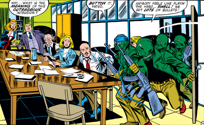 Прибыв в «Глоуб», Питер понимает, что лифты не работают. Поэтому, переодевшись в Человека-Паука, он чуть ли не бегом поднимается на четырнадцатый этаж – по стене. Там как раз толкает спич издательница газеты – мисс Клейтон. Однако её речь прерывают бандиты, прибывшие похитить её. По счастью, Человек-Паук вовремя приходит на выручку. Бандитов много, а Человек-Паук один. Но бандиты – простые люди, и против паучьей силы да скорости они бессильны.