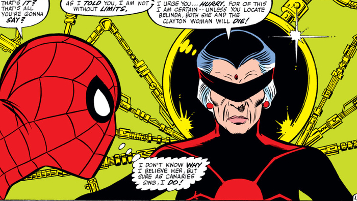 Решив довериться странной старушке, Человек-Паук показывает ей её же визитку. Мадам Паутина видит, что эта визитка принадлежала её ученице, Белинде Белл. И эта Белинда сейчас в опасности, ибо является соучастницей человека, который похитил мисс Клейтон. Похоже, у старушки таки есть способности! Мадам Паутина требует, чтобы Паук спас Белинду и мисс Клейтон – но не может сказать, где они. Говорит лишь о нагромождении поездов, будто после аварии. Ну, она ведь не всесильна, в конце концов. Ничего, Спайди и так справится.