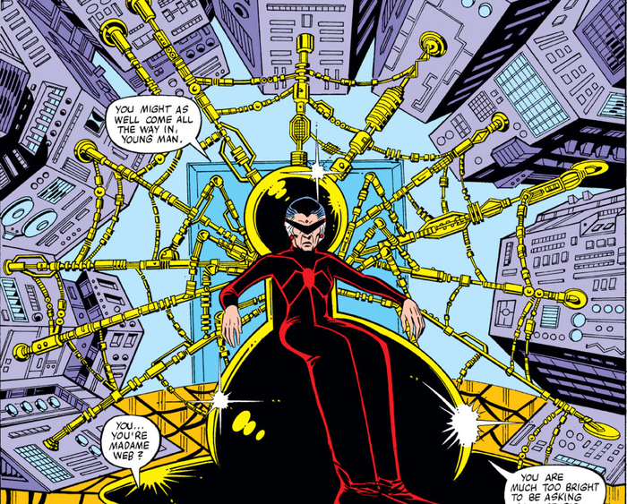 Поиски приводят Человека-Паука в квартиру Мадам Паутины – в которой установлено странное высокотехнологичное приспособление, похожее на прокачанную Экзибитом паутину. А в центре паутины – Паутина. То бишь, Мадам Паутина. Старушка поясняет, что устрашающее приспособление является хитровыдуманной системой жизнеобеспечения – без неё у Мадам и лёгкие воздух качать не будут, и сердце остановится, и электрические импульсы в мозгу угаснут. А ещё старушка признаётся, что она ясновидящая. Ну или прорицательница, оракул, на крайняк – ведьма. Можно называть, как угодно. И она способна пробуждать талант к ясновидению у других. Если он у них вообще есть.