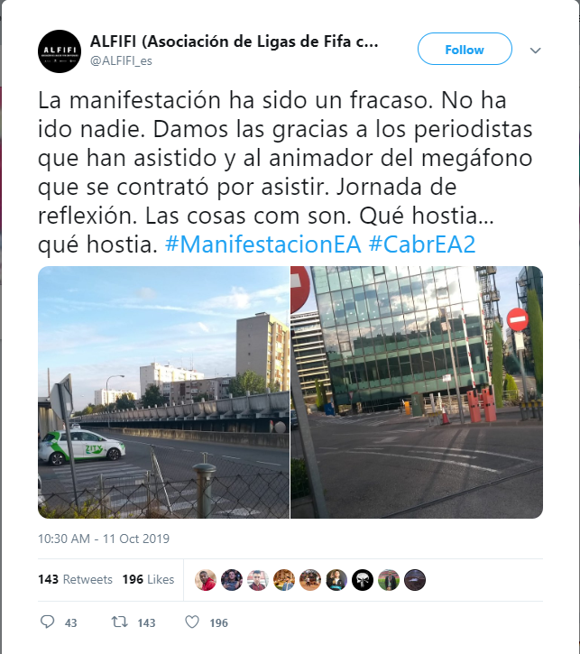 Дорогие игроки FIFA 2020 и, особенно, онлайн лиг (с подписями или автографами). От имени ALFIFI (лига любителей ФИФы) мы созвали мирный митинг перед офисом компании Electronic Arts Software (EA), расположенным в Мадриде. Основная причина, по которой мы хотим показать наше несогласие, заключается в том, что в FIFA 20 убрали красные и зеленые стрелки, указывающие на то, что средний показатель игрока был изменен в Matchday. Таким образом, игрокам онлайн-лиги сложнее знать, что кто-то, участвующий в соревнованиях, обманывает статистику футболистов или нет. Вторая причина, по которой возник этот митинг, связана с хэндикапом, алгоритмом, который модифицирует игровой опыт матчей FIFA, давая случайный компонент матчам, что вызывает большое разочарование. Поэтому очень часто было замечено, что, играя в футбольные матчи, одна команда может 40 раз пинать мяч в ворота противника и не забить ни одного гола, когда противник с легкостью подбегает и с первого раза забрасывает без труда мяч.Хватит это терпеть!Довольно обмана. Давайте бороться за чистый и справедливый симулятор по футболу. Если ты согласен со всем сказанным, то мы ждем тебя в пятницу 11 октября в 19.00 перед зданием номер 3 бизнес-парка Cristalia, Calle Vía de los Poblados, 3, 28033 (Madrid). Мы будем у главной входной двери в здание EA со сковородками, громкоговорителями и другой посудой демократии. Вы можете принести любые плакаты. Следите за новостями в Твиттере, так как мы опубликуем ссылки на чаты в Телеграмме и Вацапе, чтобы лучше организоваться. Также мы заявим об этом в СМИ, чтобы придать огласки. Это первый физический(оффлайновый)митинг в истории против политики ЕА.