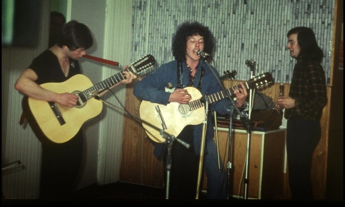 Речь идёт об исполнителях авторской песни или «бардах». Ещё в 1950-х эта культура распространилась среди студентов: молодые поэты исполняли свои песни под простые аккорды на шестиструнной гитаре. Инструменты, кстати, чаще всего брали классические, но ставили на них металлические струны, чтобы сделать звучание более громким и резким.