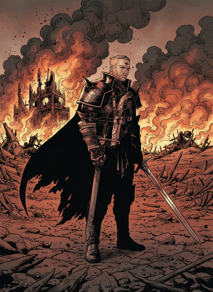 Здесь закладывается фундамент саги. Нам импонирует сам образ Дориана Хоукмуна — его эмоциональная отчужденность, граничащая с кататонией, и медленное пробуждение, превращающее его в врага Гранбретании. Гениальный ход — жемчужина, вживленная в его череп и пожирающая разум, создает постоянное напряжение. Сатира на британские нравы, воплощенная в орденах Гранбретании, чьи адепты никогда не снимают звериных масок, — это чистой воды муркоковская гротескная фантасмагория. И, конечно, невозможно забыть появление загадочного Воителя в Черном и Золотом — одного из ликов Вечного Воителя.