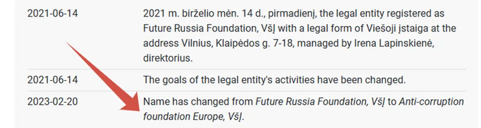 Организация не меняла учредителя и руководителя, контролировалась семьей Лапинскасов с момента основания. Как мы говорили ранее, ее не стоит путать с организацией Future of Russia Foundation Михаила Ходорковского, зарегистрированной в Великобритании, – это две абсолютно разные организации, будущий Европейский ФБК не имеет к Ходорковскому никакого отношения.