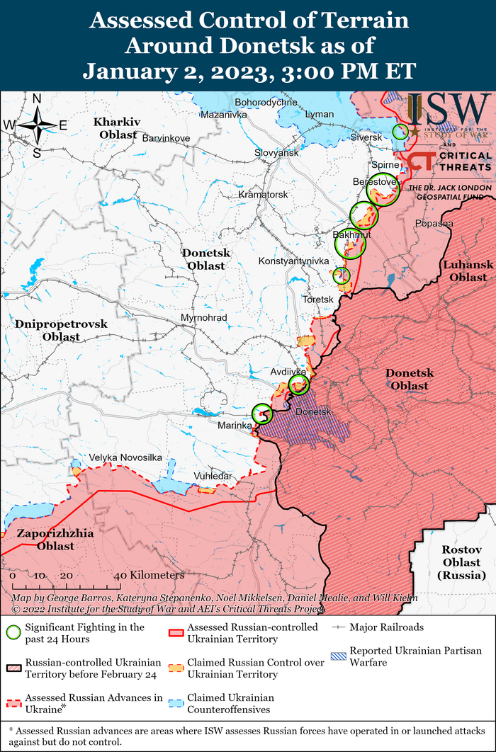 Российские силы продолжали предпринимать безуспешные попытки улучшить свои тактические позиции к северо-западу от Сватово 1 и 2 января после, как сообщается, тактической паузы в связи с новогодними праздниками. Российский военкор утверждал, что и украинские, и российские силы взяли тактическую паузу на Новый год, но, вероятно, возобновили боевые действия примерно 2 января.[39]
