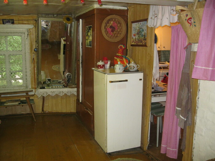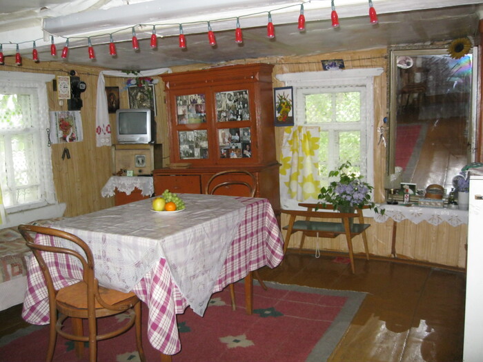Ну и разные интерьерные "мелочи": часы с кукушкой, счетчик, радиоточка, половички, газовый шкаф с баллоном, плита, телевизор, холодильник, умывальник...